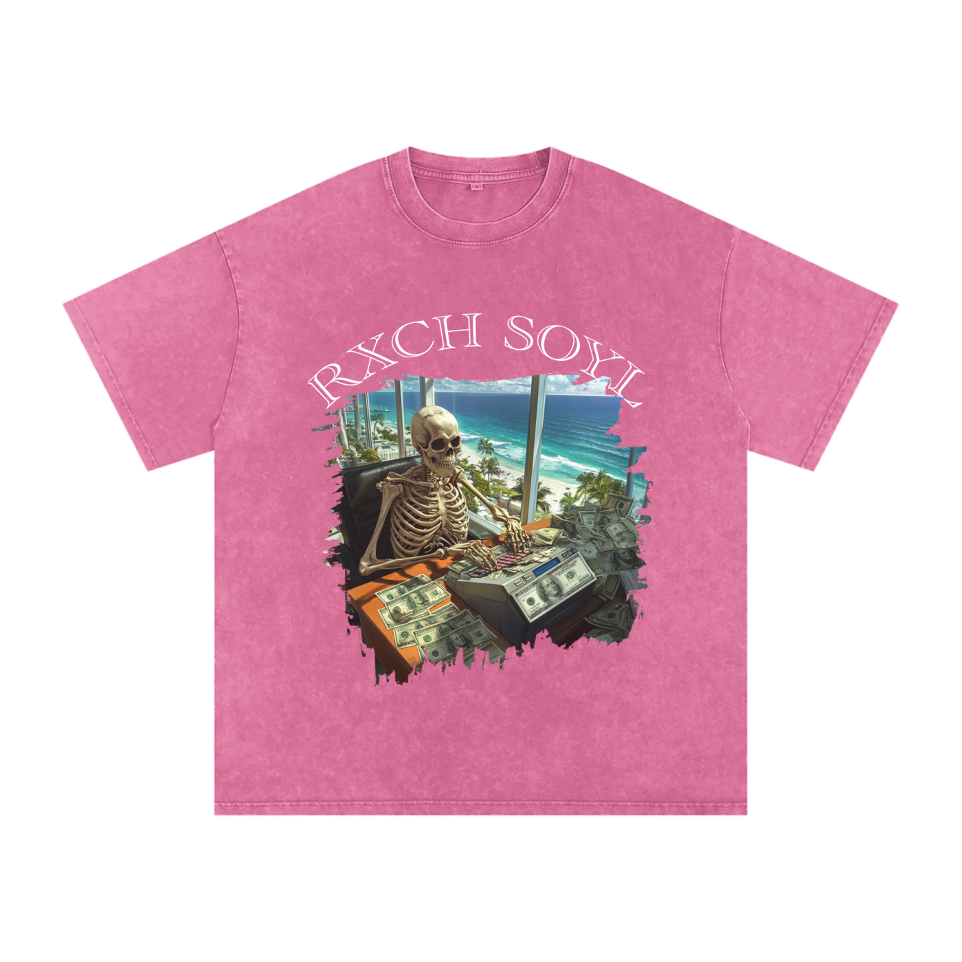 Printed on an oversized acid wash tee, this design captures the energy of a real moment: a skeleton locked in, counting stacks with a money counter.